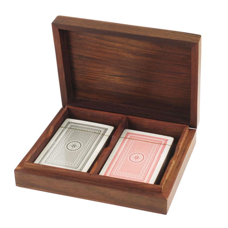 Caja de madera para guardar dos barajas de cartas.
