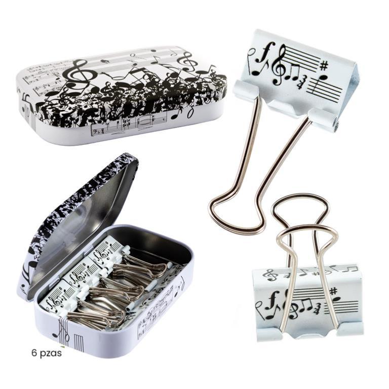 Caja metálica, decorada con motivos musicales, con 6 clips.