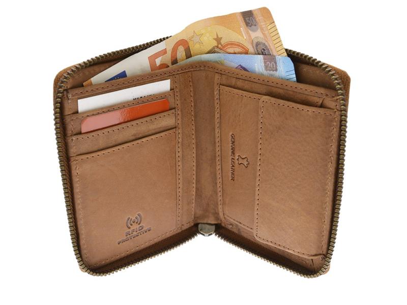 Cartera clásica con cierre de cremallera, interior con doble billetera, monedero y capacidad para 8 tarjetas.