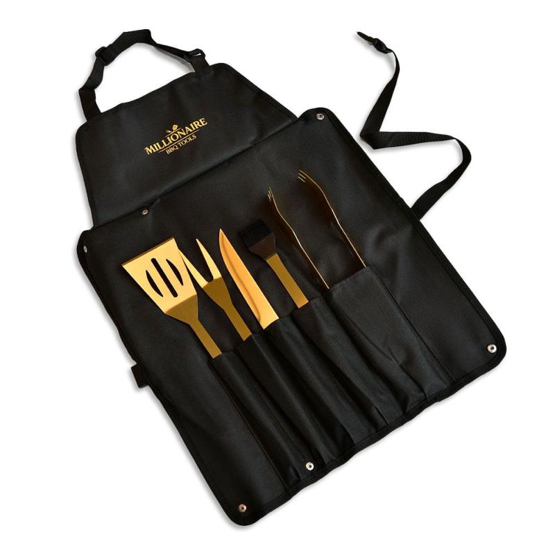 Luce espectacular cada temporada de barbacoa con las Herramientas para Barbacoa Millionaire : un juego premium de 5 piezas diseñado para quienes buscan destacar. Presentado en un elegante estuche de viaje negro que se pliega para convertirse en un práctico delantal, este juego de herramientas con acabado dorado combina lujo y funcionalidad.