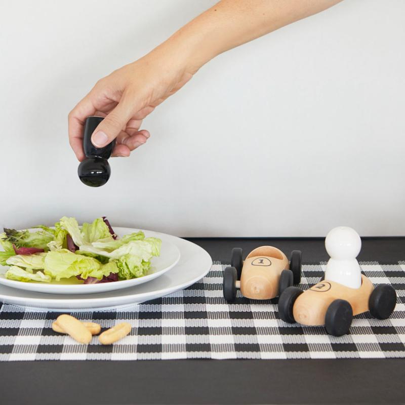 Set sal & pimienta Bolides Conjunto de salero y pimentero con bases de madera en forma de coches de carreras Madera/cerámica. CONTENIDO. 2 bases de madera en forma de vehículos, 1 salero y 1 pimentero que simulan los pilotos